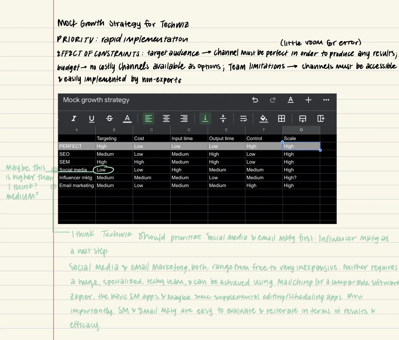 My project this week was creating a channel matrix for a mock company, and then utilize my findings to draft a growth strategy for them. This strategy was complete with optimization priorities, constraints, the whole nine. Here are some of my notes as I was prepping for that: